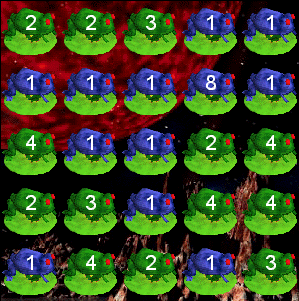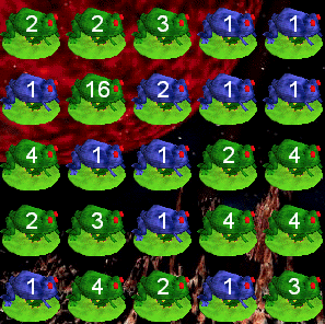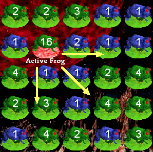 If a Green frog lands on a Green frog, it stays green. If a Green frog lands on a Blue frog, it becomes blue. Whenever a frog becomes a 1 frog, it becomes a blue frog. Let's just play a few turns... YOU'LL LEARN THE RULES AS YOU PLAY! Some folks play and ignore the rules!
