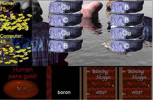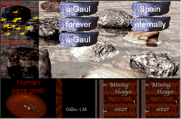 In the above example, after a few seconds the names on the rocks will go away and the first player (Human) will then have a chance to start panning (mining) for gold under the rocks. If Human knows that his "Gallus, -i M." tool matches the "a Gaul" rocks AND remembers which rocks are "a Gaul" rocks, then he'll click on those rocks with that tool selected and collect all the gold under those rocks. Human's opponent will be watching closely, and if Human picks the wrong rock, his opponent will see what kind of rock it is and can select the correct tool for his turn...