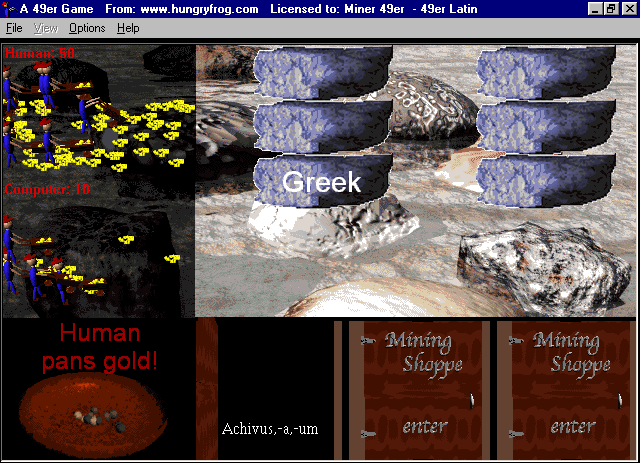 For example, in a screen shot from another game where it is later in the game, both players have collected more gold. In the screen shot below, the player named "Human" has just correctly selected the "Greek" rock which matches his "Achivus, -a, -um" tool, and his 49er Miner friends are delivering his gold. His computer opponent's 49er Miner friends are finishing up their delivery of gold from the previous turn (the 49er Miners under the Computer's score tally).