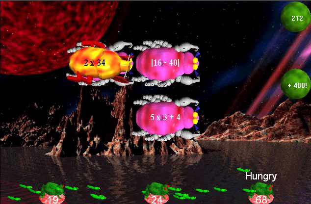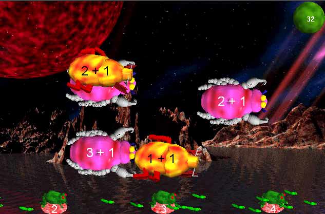 When the equation generator is set to generate equations of greater complexity, multiple equations are often generated which evaluate to the same result (e.g. 12 - 4, 2 x 4, 32 - 3 x 8). In this case, one Frog will match several Bugs. In fact, as a general rule, whenever the equation generator parameters allow, the equation generator creates many Bugs for each Frog. This screenshot shows a sample Game World resulting from the equation generator settings outlined above.