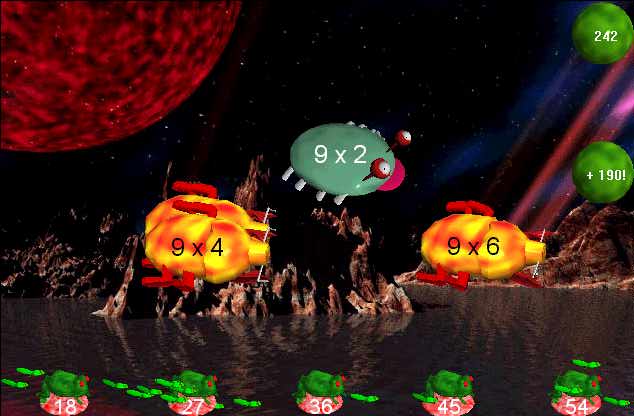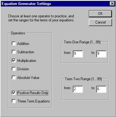 The game can be configured to teach an extremely wide variety of math skills. For example, it is easily configured to run as an application dedicated to practice of multiplication tables only. The game may also readily be set up to focus solely on the most basic principles of addition or subtraction. The game only quizzes on the equation sets defined in the equation generator dialog and does NOT presume to know better than you do what problems to present to you (or your child). Equations are only generated within the bounds of the specified parameters. If you feel the equations generated are too simple or too complex, you merely change the parameters to adjust play accordingly.