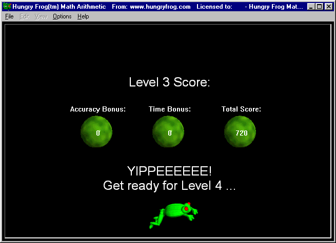 When you clear the board of bugs, if you have done well at your current level, you will move to the next level and get a new Frog (up to a maximum of 8). If you had problems at your current level, you will remain at that level. If you had severe difficulty in finishing the current level, then you may be bumped down to a lower level to play it again.