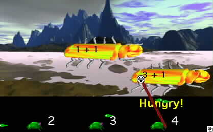 As the snippet indicates, the game format is modified to allow for multiple "hits" or "bites" to occur to each bug before it is eaten by a frog. For example, in the above snippet the "1" frog must bite the bug three more times before it is consumed. This game particularly requires quick thinking at higher levels of play where complex combustion equations are encountered.