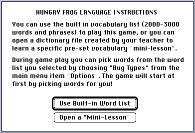 Note: v2.3 and higher allow you to create an unlimited number of your own dictionaries using a text editor (like SimpleText). If you have not yet made word lists to match your lessons or texts, you can always choose to use the built in dictionary instead. Directions for creating your own dictionaries are included with the sample dictionaries included with your game module.