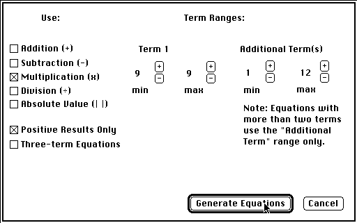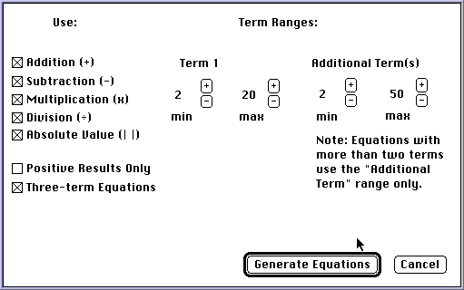 The game only quizes on the equation sets defined in the equation generator dialog and does NOT presume to know better than you do what problems to present to you and your child. Equations are only generated within the bounds of the specified parameters. If you feel the equations generated are too simple or too complex, you merely change the parameters to adjust play accordingly.