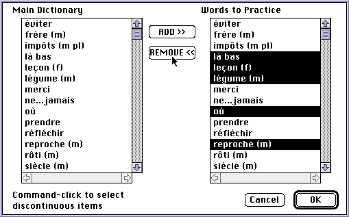 Students construct their personal dictionaries by selecting words in the main dictionary and adding them to their personal dictionary (or selecting them in their personal dictionary and removing them from it).