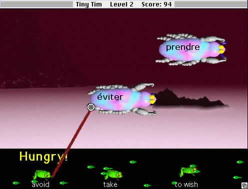To play, you have to keep your Hungry Frog family alive by helping your frogs eat. You must direct your frogs to eat the wiggling bugs flying overhead. In Hungry Frog French, you match frogs to bugs by matching French words or phrases on the bugs to the corresponding English meaning(s) on the frogs.