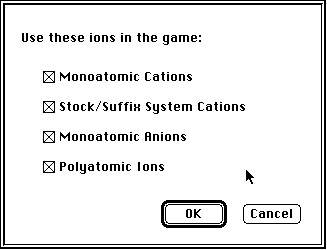 Chemistry I teaches the charges & formulae of all of the ions commonly encountered in typical introductory chemistry classes. The ions are divided into four classes and in the "Bug Types" menu selection from the "Game Options" menu you can choose which ion classes to study.