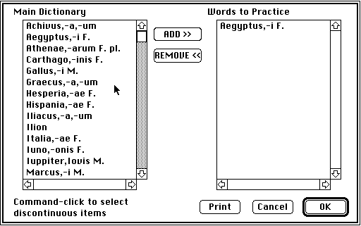 In this game the user selects words to practice from a 2000 word Latin dictionary with over 3000 corresponding English definitions. Personal dictionaries are automatically saved by player name, and up to 50 different students can have their own personal preferences stored in the game at any one time. Therefore, it is important that the student enter their name consistently each time s/he plays the game.