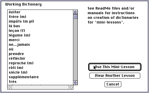 Once you choose a vocabulary lesson "Mini-Lesson" file, you will be able to review it and select it or review other lessons. If you choose "Cancel" at this time, you will start the game using the built-in dictionary.