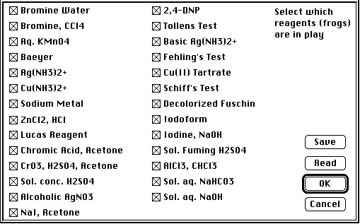 Chemistry II teaches the reagents of organic qualitative analysis. Because of the complexity of this topic, we recommend leaving the automatic help option turned on to reinforce reaction mechanisms and issues of poly-functionality. The reagent types to be learned are presented in the "Bug Types" dialog. The detailed help screens give reaction mechanisms and examples to illustrate how the functional group(s) of the substrate react with the reagent(s) for analysis. Note that in this game it is quite common for a given substrate to give a positive test with more than one reagent. This means that generally more than one "frog" (reagent) can eat the same "bug" (substrate). As in the other games, clicking on a "bug" will invoke the help dialogs. In this game each of the reagents on screen which give a positive test will be marked in the help sequence.