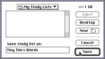 At the end of each game-session (when the application is quit), you are given the option to save a study list to disk. The study list consists of all of the dictionairy words (and their definitions) which you encountered during the game session. Words with which you had difficulty are flagged with one, two or three '*' characters to bring attention to words which should be reviewed more carefully.