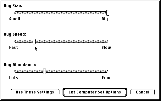 The program keeps track of your performance during the game and adjusts game difficulty settings to match your ability. However, you may over-ride the computer generated settings at any time by choosing "Use These Settings" in the "Bug Stuff" menu dialog after you have adjusted game parameters to your satisfaction.