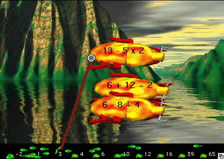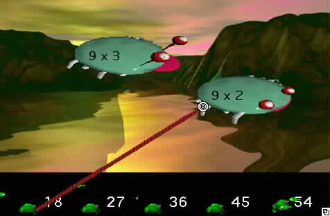 The game can be configured to teach a variety of math skills. For example, it is easily configured to run as an application dedicated to practice of multiplication tables only. The game may also readily be set up to focus solely on the most basic principles of addition or subtraction. In this mode the game follows perfectly after Hungry Frog Math II, and the similar game format creates a natural transition from learning the sequence of integers on the number line (counting by ones) to understanding more complicated addition problems.