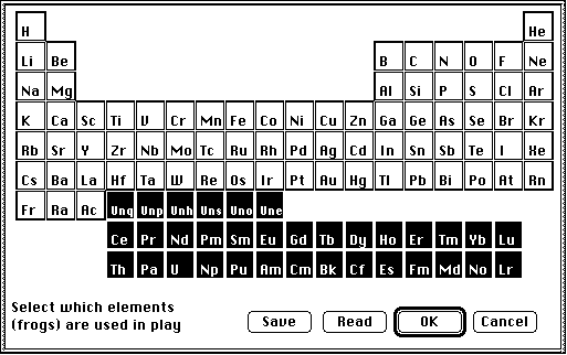 Because of the limited number of posible ion charges, the maximum number of frogs attainable in the game is restricted. Advanced students will want to be sure to set the starting number of frogs to the maximum before they begin play - this option is set using the slider in the opening player name dialog box.