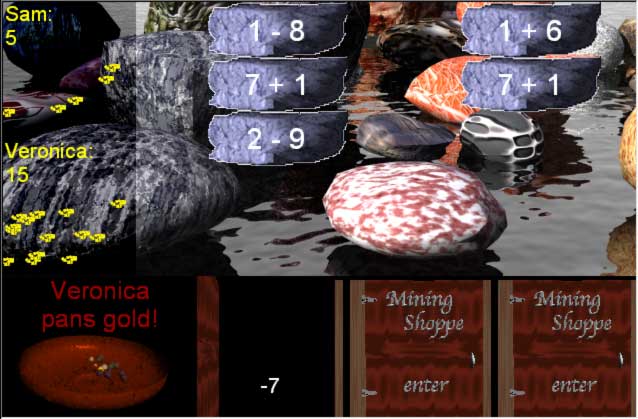 In the 49er Gold Rush games you are a 49er playing against either a computer opponent or another person. Your goal in the game is to mine more gold that your opponent. You mine gold by turning over rocks to discover gold underneath. In 49er Gold Rush Math Arithmetic you are solving math arithmetic equations by matching mining tools (solutions) to stone (equations). You can use the equation editor to point and click you way to an unlimited number of automatically generated equations.