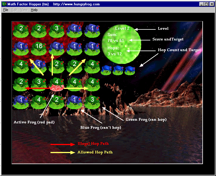 This is a screen shot showing the game in play in Level 2. Your goal in the game is to make the sum of all the numbers on the board as small as possible, and you do this by "factor hopping" one frog over another. The hopping frog hops over a factor of itself, the factor is removed, and the result is multiplied into the destination frog. You want to get the smallest sum in the fewest hops! Your hops are tallied to the right of the board (hopping frogs keep count of your "hop count"). You can replay a game level to try to better your score, or you can just move up a level as you complete each game board.