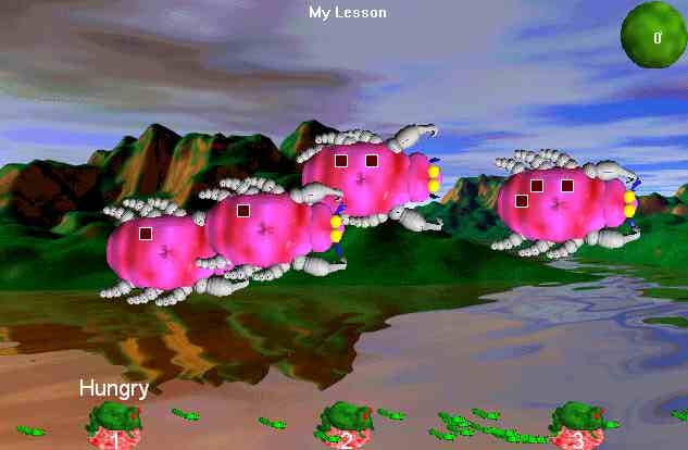 In MacOS Hungry Frog games, frogs are endangered species, and the world is overcome with bizarre and unusual bugs. Your frogs must eat as many bugs as possible to get fat, make tadpoles and multiply. Hungry fish compete by eating your helpless tadpoles. Read the on-line MacOS manual, or have a look at student raves to learn more. This little animation shows the basic game set-up (minus fish, tadpoles, sounds, educational content...) |