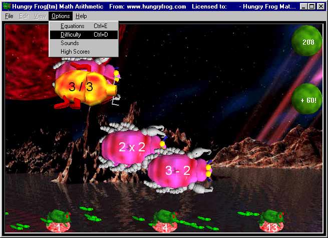 You use the EQUATION GENERATOR to create unlimited arithmetic problems. You can practice addition, subtraction, multiplication, division and even absolute value. You set equations to yield both positive and negative results. You can choose 2 term or 3 term equations (operator precedence). You pick what numbers to use in your equations, so you practice only problems you want. If you feel equations are too simple or too complex, you merely change settings accordingly. With a few mouse clicks you can set the game to teach multiplication tables or you can just as easily focus on the most basic principles of addition or subtraction (e.g. counting up or down by ones). You can easily create complex equations too. Term values can range from 0 to 99 in up to three terms with mixed operators. Going far beyond "multiple choice", the equation generator creates many equations evaluating to the same result (e.g. 12-4, 2x4, 32-3x8). This unique Hungry Frog disjoint set matching lets each of many "frogs" simultaneously match several "bugs" in the game scenario.