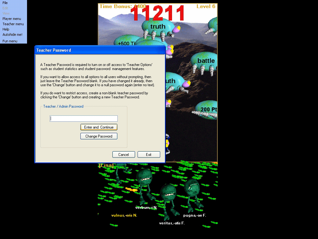 IMPORTANT: The blank or password (where you type nothing in the password box or delete all existing text and type nothing to replace it) is special for the teacher password. NO PASSWORD PROTECTED FEATURES ARE BLOCKED IF THE TEACHER PASSWORD IS BLANK. The reason for this is so that you can easily switch from a password protected game state to an unprotected game state just by changing the password but not by changing any of your password protection preferences. If you want your password protections to be enabled, make sure you use a non blank password.